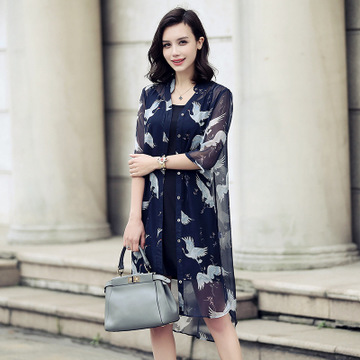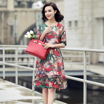 歐洲站2016新款女裝真絲連衣裙中長款圓領(lǐng)印花桑蠶絲連衣裙兩件套 /