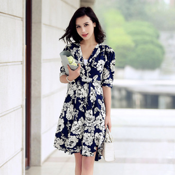 2016新款女裝高檔印花絲麻連衣裙夏季圓領(lǐng)五分袖度假沙灘裙中長款 /