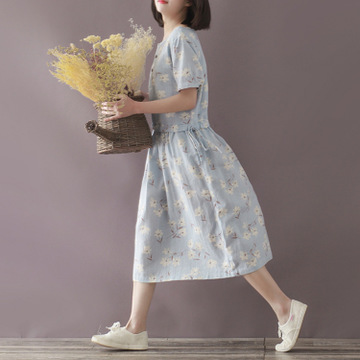 2016文藝小清新收腰顯瘦印花連衣裙棉麻短袖女裝夏新款長裙 /