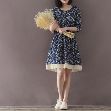 夏季新款典雅文藝復(fù)古棉麻純棉寬松大碼碎花連衣裙女蕾絲邊裙擺 /