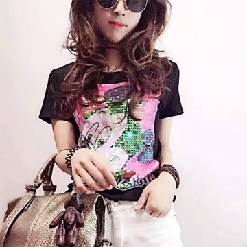 韓版米老鼠T恤女裝重工印花亮片夏裝短袖體恤上衣服純棉打底衫 /