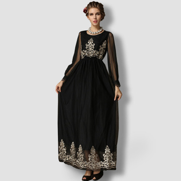 復古 金絲繡花 定位長袖連衣裙 精致網(wǎng)紗鏤空拖地長裙 /