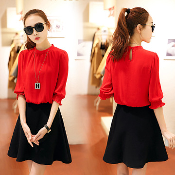 2016春夏裝新款女裝打底衫歐洲站修身中袖連衣裙雪紡衫A字套裝裙 /