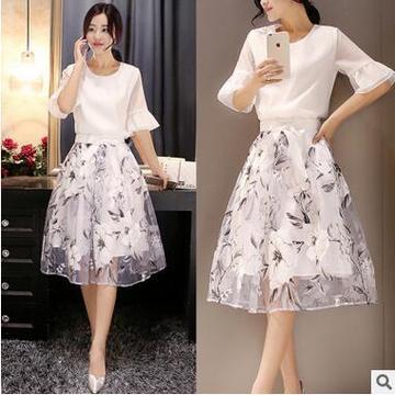 2016夏季新款韓版女裝雪紡短袖氣質(zhì)印花歐根紗連衣裙兩件套裝 /