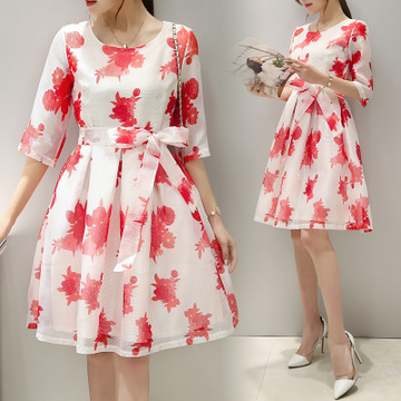 2016新款女裝夏裝紅色印花韓版修身連衣裙女歐根紗中袖收腰中長裙 /