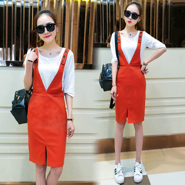 2016夏季新品開叉高腰背帶連衣裙女性感包臀修身歐洲站裙子潮 /