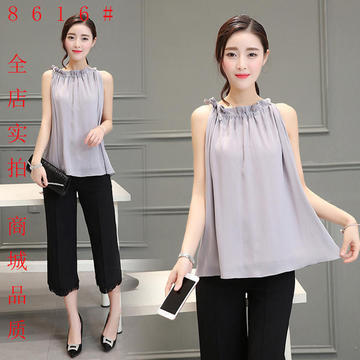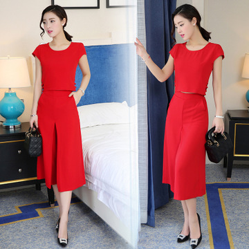 2016夏裝新款短袖雪紡兩件套小香風(fēng)時尚闊腿褲腰部鏤空七分褲套裝 /