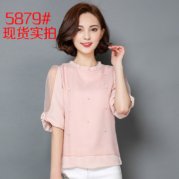 新款2016春裝韓版女裝立領(lǐng)釘珠拼歐根紗百搭雪紡衫 /