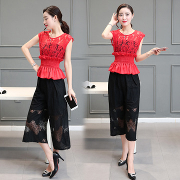 2016夏裝顯瘦無袖蕾絲上衣女潮小香風(fēng)名媛鏤空闊腿褲兩件套套 /