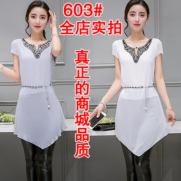 實拍2016夏裝新款短袖t恤女 釘珠V領(lǐng)中長款雪紡衫 送腰帶 /