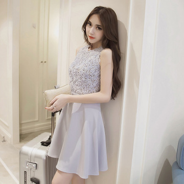 2016夏款優(yōu)雅盤花蕾絲拼接高腰無袖立體大擺連衣裙 /