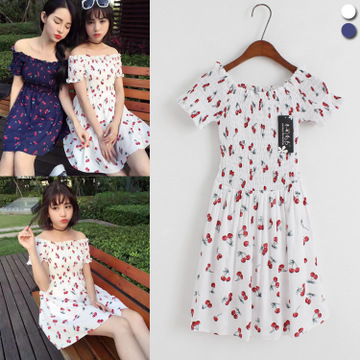 2016春夏季新款韓版女裝時尚性感一字領短袖櫻桃印花收腰連衣裙子 /