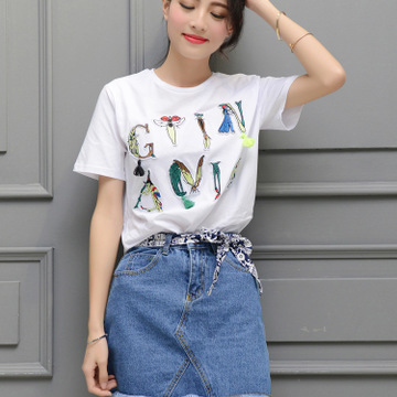2016夏季新款T恤字母刺繡棉T恤女上衣+牛仔短裙半身裙+碎花腰帶 /