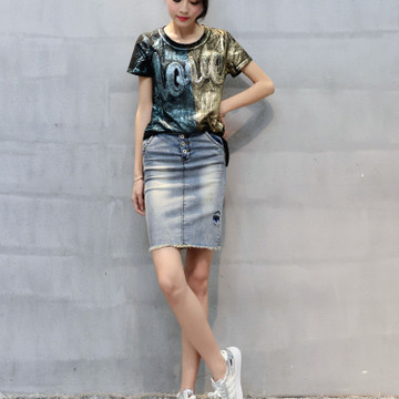 2016夏季新款燙彩金印銀色刺繡英文字母T恤女+牛仔半身裙兩件套 /