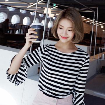 2016年韓國夏季新款時尚簡約條紋T恤七分袖喇叭袖基礎打底體恤女 /
