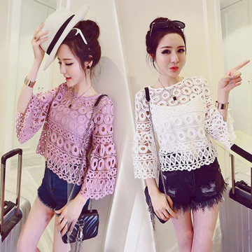 最新時(shí)尚喇叭袖圈圈水溶蕾絲衫+百搭包臀緊身牛仔短褲套裝638 /