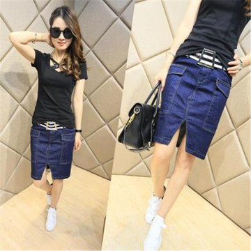 2016韓版修身牛仔包臀雙口袋前開叉包裙一步裙半身裙中長(zhǎng)裙 /