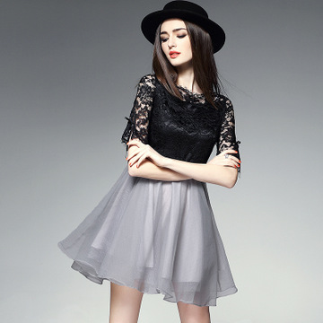 歐洲站 2016春夏新款女裝 時(shí)尚一字領(lǐng)鉤花鏤空高腰公主蕾絲連衣裙 /