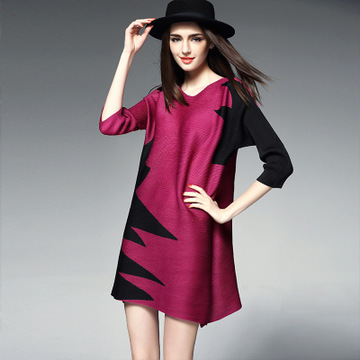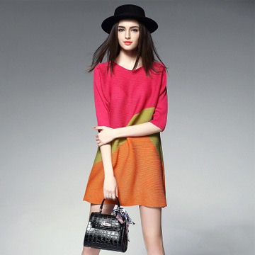 歐洲站 2016春夏新款女裝 時(shí)尚三宅褶皺五分袖 寬松圓領(lǐng)連衣裙 /