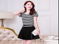 短袖雪紡連衣裙女裝中長款假兩件套2016夏裝新款韓版條紋修身顯瘦 /