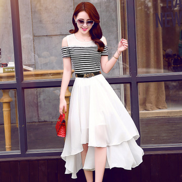 新款韓版女裝2016夏季短袖露肩長裙修身 套裝裙兩件套網(wǎng)紗裙 /