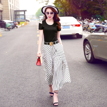 2016夏季新款女修身露肩條紋闊腿褲套裝兩件套褲 一件代發(fā) /