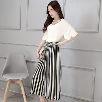 圓領(lǐng)短袖純色修身T恤+松緊腰條紋闊腳褲時(shí)尚氣質(zhì)新款一件代發(fā)爆款 /