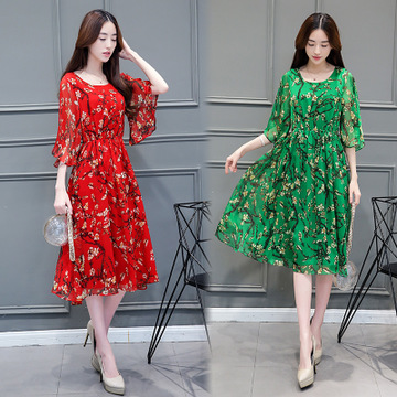 2016春裝新款女裝韓版碎花裙中長款顯瘦A字裙時(shí)尚印花連衣裙女潮 /
