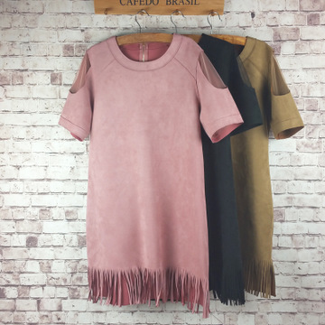 2016春夏裝新款歐美高端寬松麂皮蕾絲拼接透視連衣裙流蘇套頭女 /