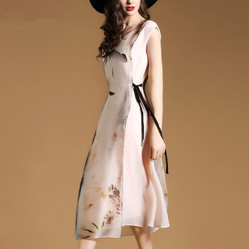 春裝新款女裝2016歐根紗女士印花無袖連衣裙 /