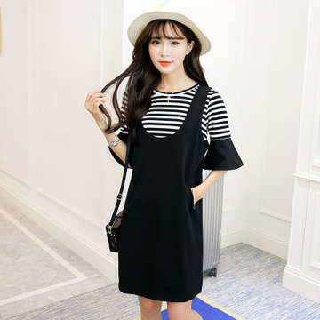 實拍2016夏季新款韓版背帶裙喇叭袖條紋T恤 /