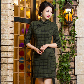 2015新款秋裝短款高檔旗袍 七分袖加厚雙層毛呢婚慶禮服連衣裙 /
