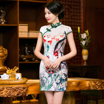 2016新款旗袍裙復(fù)古改良時(shí)尚修身短款夏 日常絲綢旗袍連衣裙女 /
