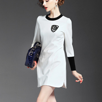 衣絮春裝新款女裝2016圓領(lǐng)拼色修身短裙秋季新品長袖下擺開叉連衣 /