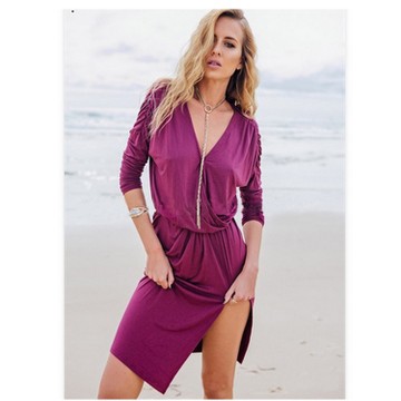 速賣通ebay歐美春秋裝新款性感深V領(lǐng)長袖束腰側(cè)開叉純色連衣裙 /
