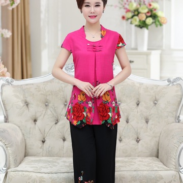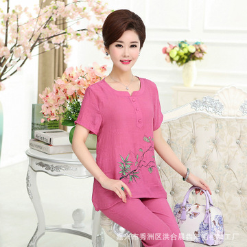 2016夏季新款中老年女裝套裝 寬松媽媽裝亞麻印花短袖清涼套裝 /