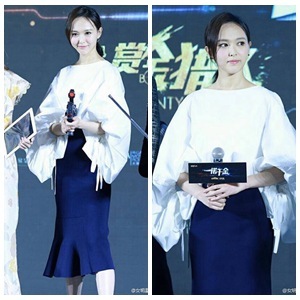 2016賞金獵人發(fā)布會唐嫣同款白色燈籠七分袖上衣 藍色魚尾半身裙 /