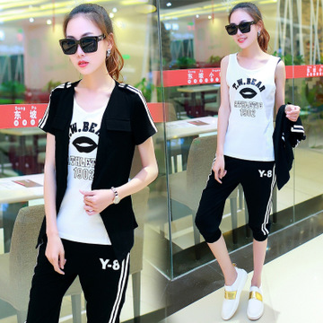 夏季新款圓領(lǐng)短袖七分褲休閑套裝女 韓版修身女士運(yùn)動(dòng)套裝三件套 /