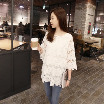 2016春季新款小香風(fēng)甜美性感鏤空寬松打底衫上衣蕾絲衫 /