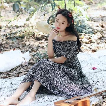 廠家直銷春季新款韓版性感 百搭碎花一字肩連衣裙批發(fā)一件代發(fā) /