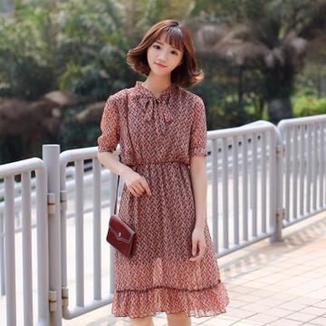 一件代發(fā)2016夏季新款韓版樹葉蝴蝶結(jié)領(lǐng)口短袖連衣裙批發(fā)廠家直銷 /