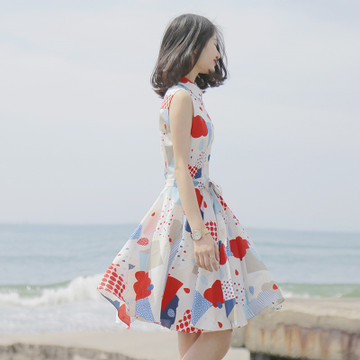 2016夏季新款甜美修身顯瘦百褶裙蝴蝶結(jié)腰帶幾何雨滴無(wú)袖連衣裙女 /