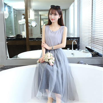 2016夏裝新品時(shí)尚韓版修身顯瘦圓領(lǐng)網(wǎng)紗拼接無(wú)袖背心打底連衣裙女 /