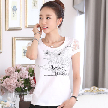 實(shí)拍短袖T恤夏季2016夏新款韓修身顯瘦純棉蕾絲打底衫女一件代發(fā) /