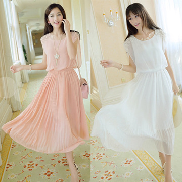 2016夏裝新款雪紡連衣裙 韓版無袖釘珠雪紡壓褶長裙子 /