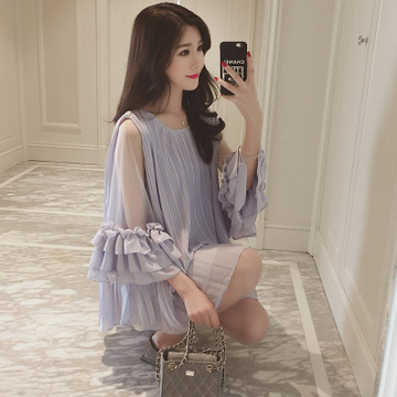 大碼女裝夏季大版百褶裙拼接網(wǎng)紗荷葉袖雪紡衫胖mm連衣裙女 /