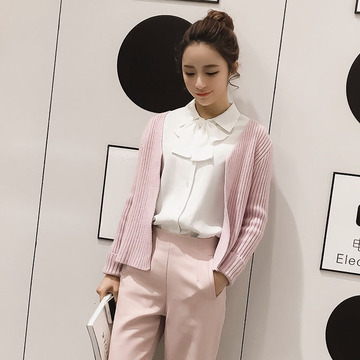 2016春季韓版新款V領(lǐng)針織開衫長袖螺紋無扣高腰短款小外套女潮款 /
