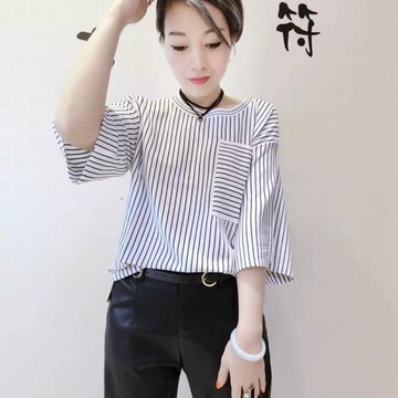2016韓版新款黑白條紋套頭圓領(lǐng)冰絲中袖T桖女短款寬松時尚爆款潮 /