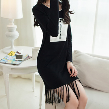 2016春季韓版新款圓領(lǐng)套頭印花圖案修身顯瘦中長款長袖流蘇針織女 /