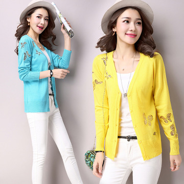 2016春夏季新款針織衫 甜美蝴蝶花純色休閑長(zhǎng)袖女士針織開衫 /
